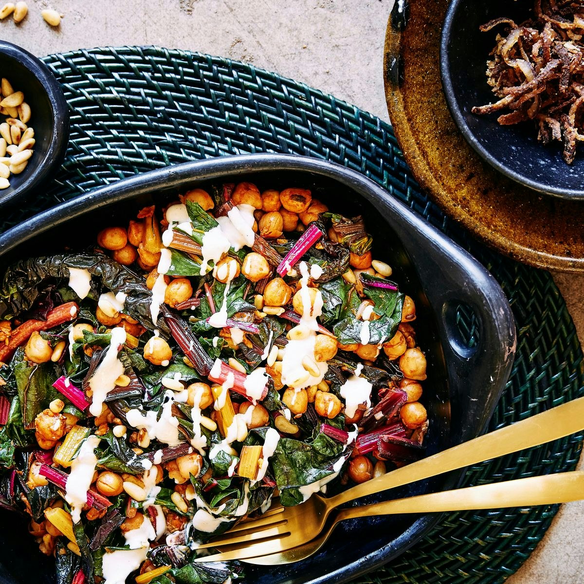Rainbow Chard and Spiced Chickpea Salad with Pine Nuts